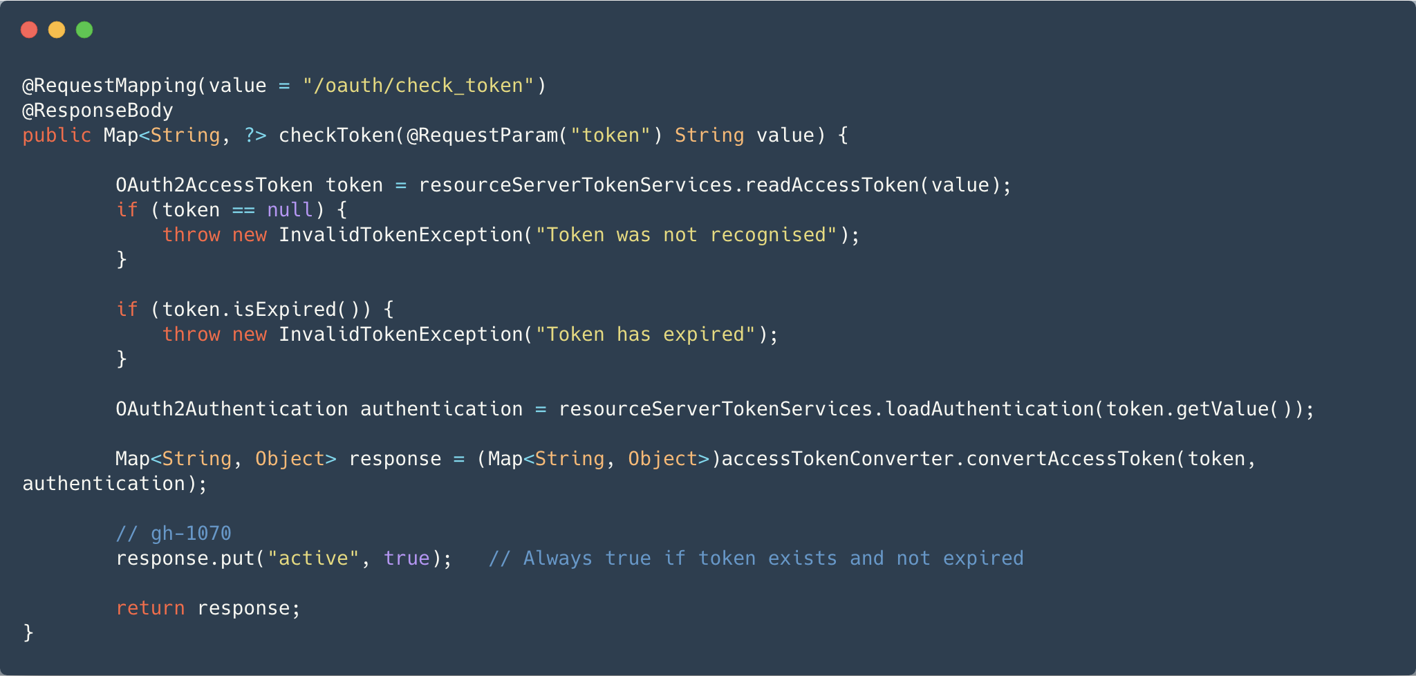 - CheckToken 处理逻辑很简单,就是调用redisTokenStore 查询token的合法性,及其返回用户的部分信息 (username )