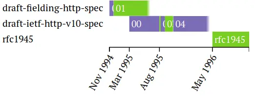 Interestingly, in the course of my work I found that the above visualisation is incorrect. It is missing draft-ietf-http-v10-spec-05 for some reason. Since the I-D lifetime is 6 months, there appears to be a gap before it became an RFC, whereas in reality draft 05 was still active through until August 1996.