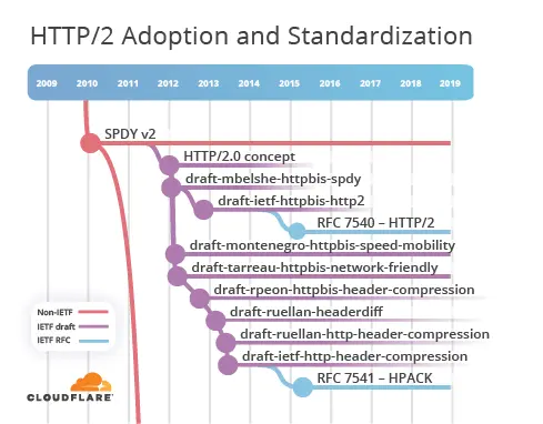 Although HTTP/2 was in the process of being standardised, there was still benefit to be had from using and experimenting with SPDY. Cloudflare introduced support for SPDY in August 2012 and only deprecated it in February 2018 when our statistics showed that less than 4% of Web clients continued to want SPDY. Meanwhile, we introduced HTTP/2 support in December 2015, not long after the RFC was published, when our analysis indicated that a meaningful proportion of Web clients could take advantage of it.