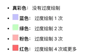 可以看到文字和图片部分都显示了红色,应该尽可能的将其变成真彩色或仅有 1 次过度绘制(蓝色)的视觉效果,如下: