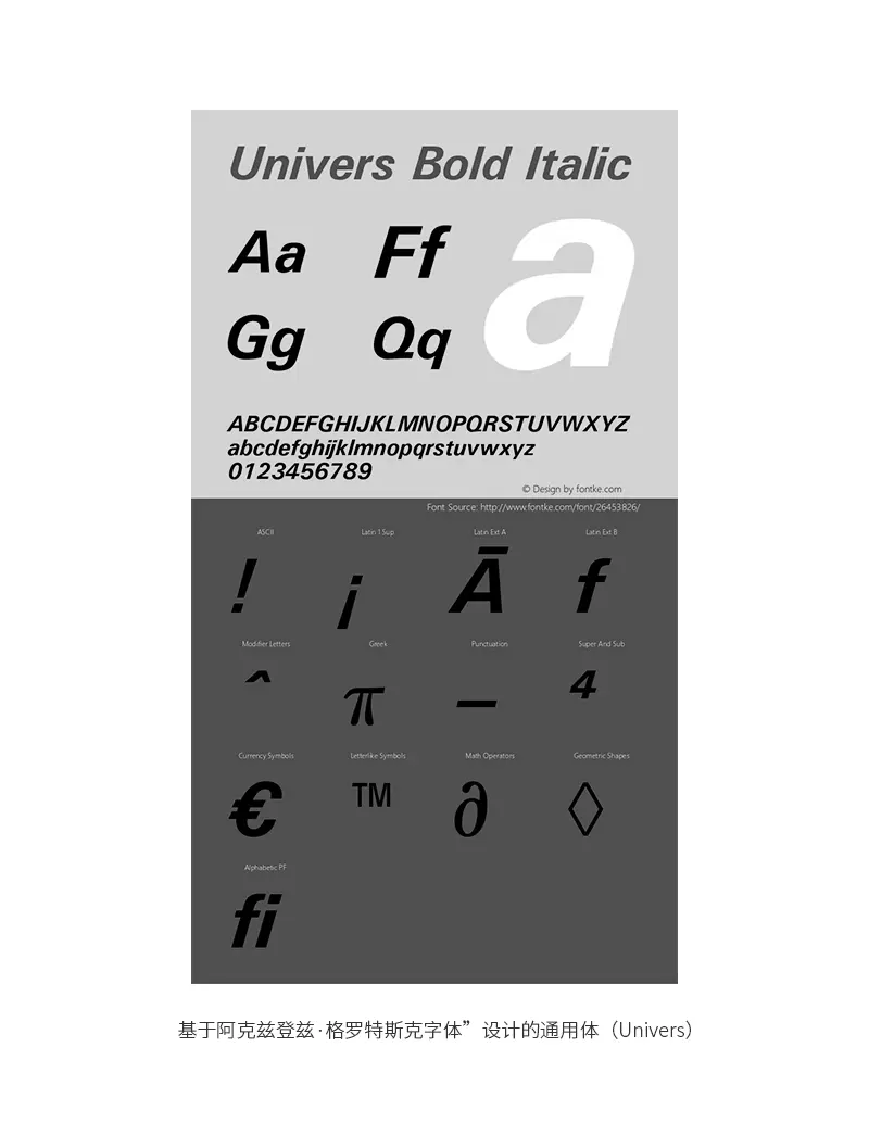 这个字体后来被一名在法国巴黎发展的瑞士设计师阿德里安选中了进行改造,创造出一套有21种不同大小字号的新无衬线体,命名为“通用体(Univers)”,这个字体的特点是21种字号的高度都是相等的,所以即便不同号的同种字体用在一起也同样清晰和谐,不至于因为字号不同而产生冲突。