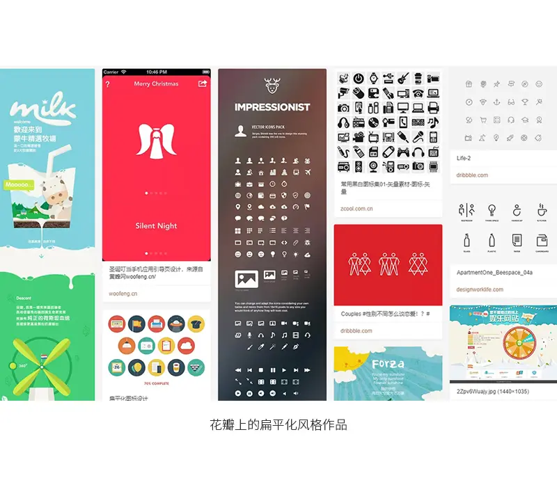 比方我们在花瓣上搜索扁平化风格,得到如下这些图(话说最近花瓣网不知道什么缘故挂了):