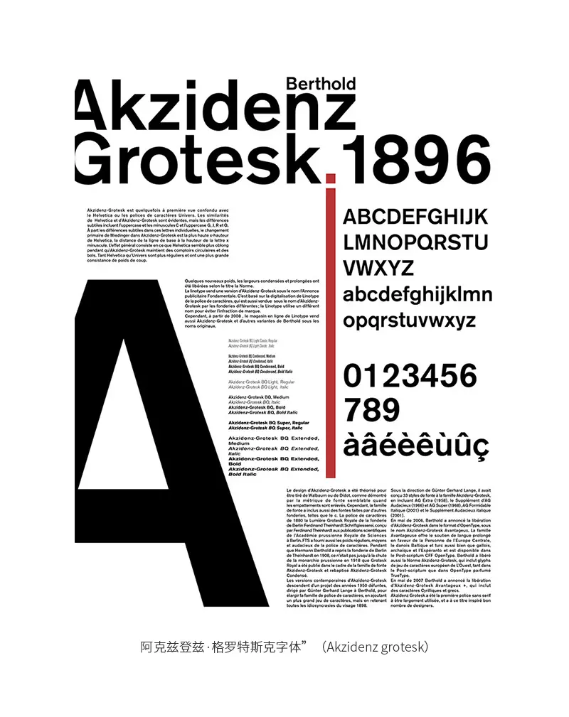 这款字体其实有一个前身,叫“阿克兹登兹·格罗特斯克字体”(Akzidenz grotesk),这款字体可以追溯到1896年那么久,据闻它可能是 Walbaum (沃保尔)或者 Didot(迪德勒) 这两种衬线字体的衍生物,这款字体当中汇集了蛮多怪诞的几何元素,有突出形式感,如下图所示: