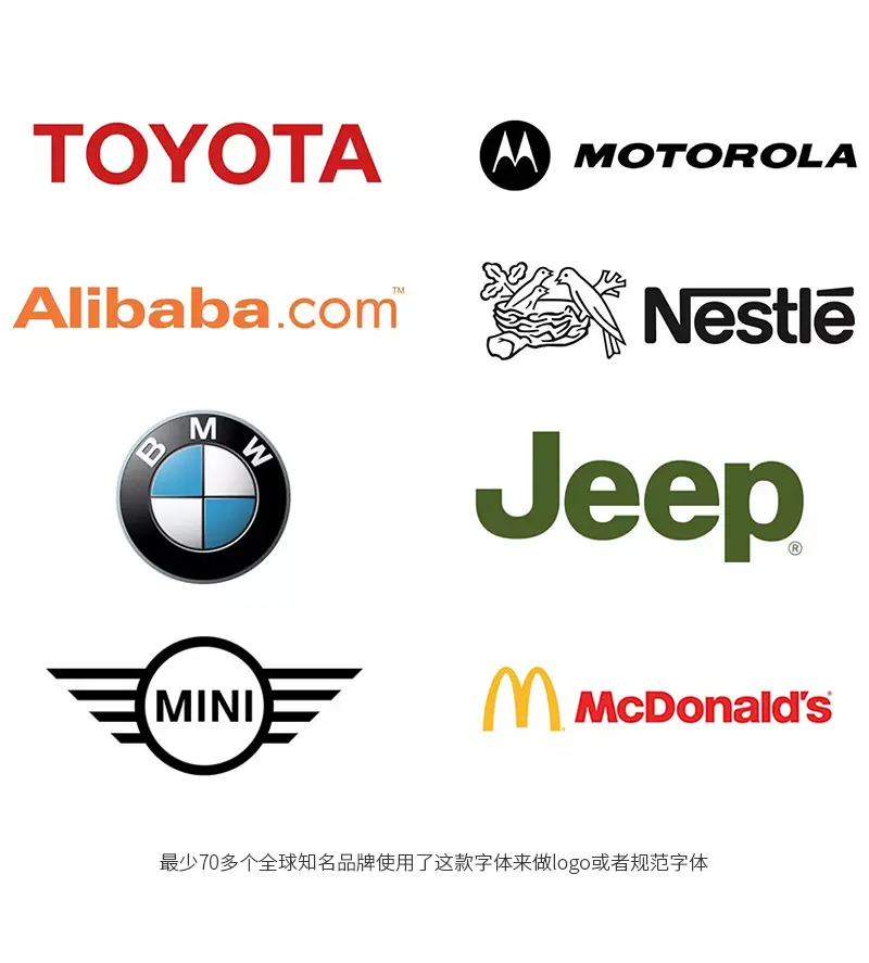 根据统计,最少有70多个全球知名品牌使用了这款字体来做logo或者规范字体,其中包括:阿里巴巴、宝马、爱普生、芬迪、Jeep、无印良品、雀巢、松下、微软、丰田、渣打银行等世界大品牌企业的标志都使用了Helvetica(海维提卡)字体。