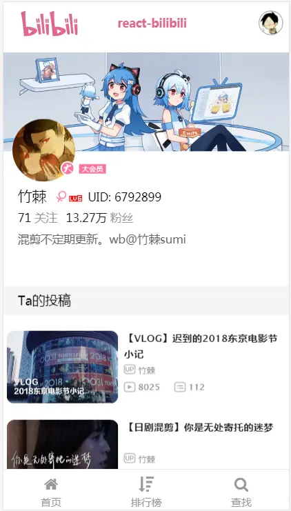 ui设计上大部分是仿的b站,但是总体的结构还是我自己来的。并不是全部的高仿,react的单数据让我这个用惯了vue的人也别扭了半天,最难受的当然还是jsx语法。