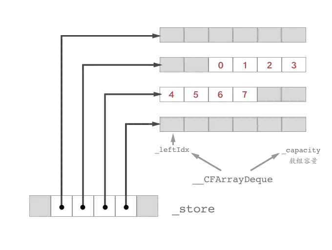 在修改元素的操作中,CFArray 也略显得暴力一些,先对数组进行大块的分区操作,再按照顺序填充数据,组合成为一块新的双端队列