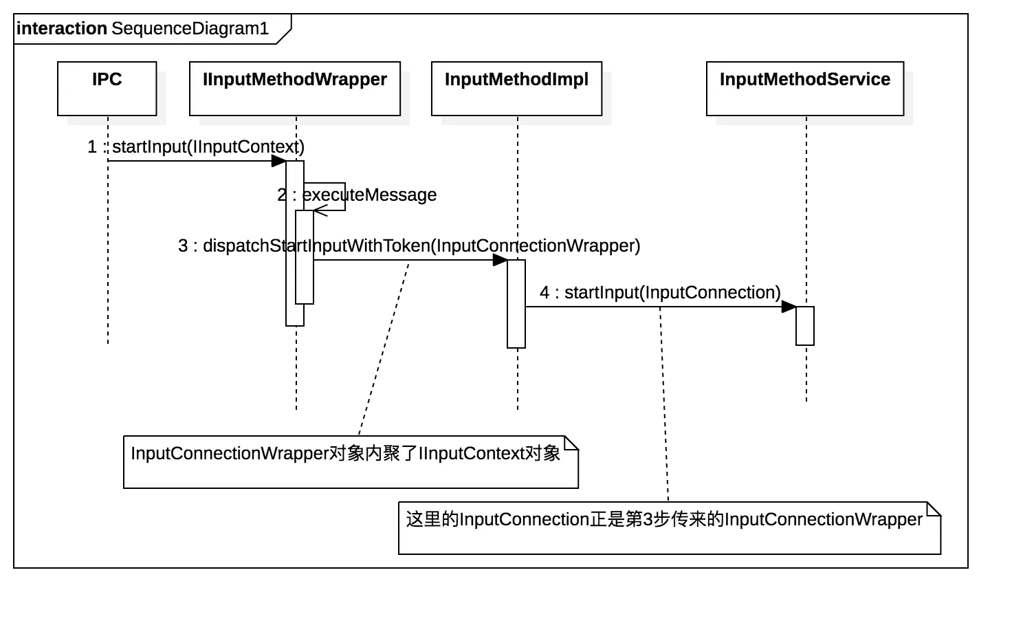 概括说,service通过onBind()返回一个继承了Stub的IInputMethodWrapper对象,IInputMethodWrapper内部弱引用了一个InputMethodImpl对象。那么InputConnectionWrapper对象是如何被最终传递给service的呢。于是我画了一个时序图,如下。