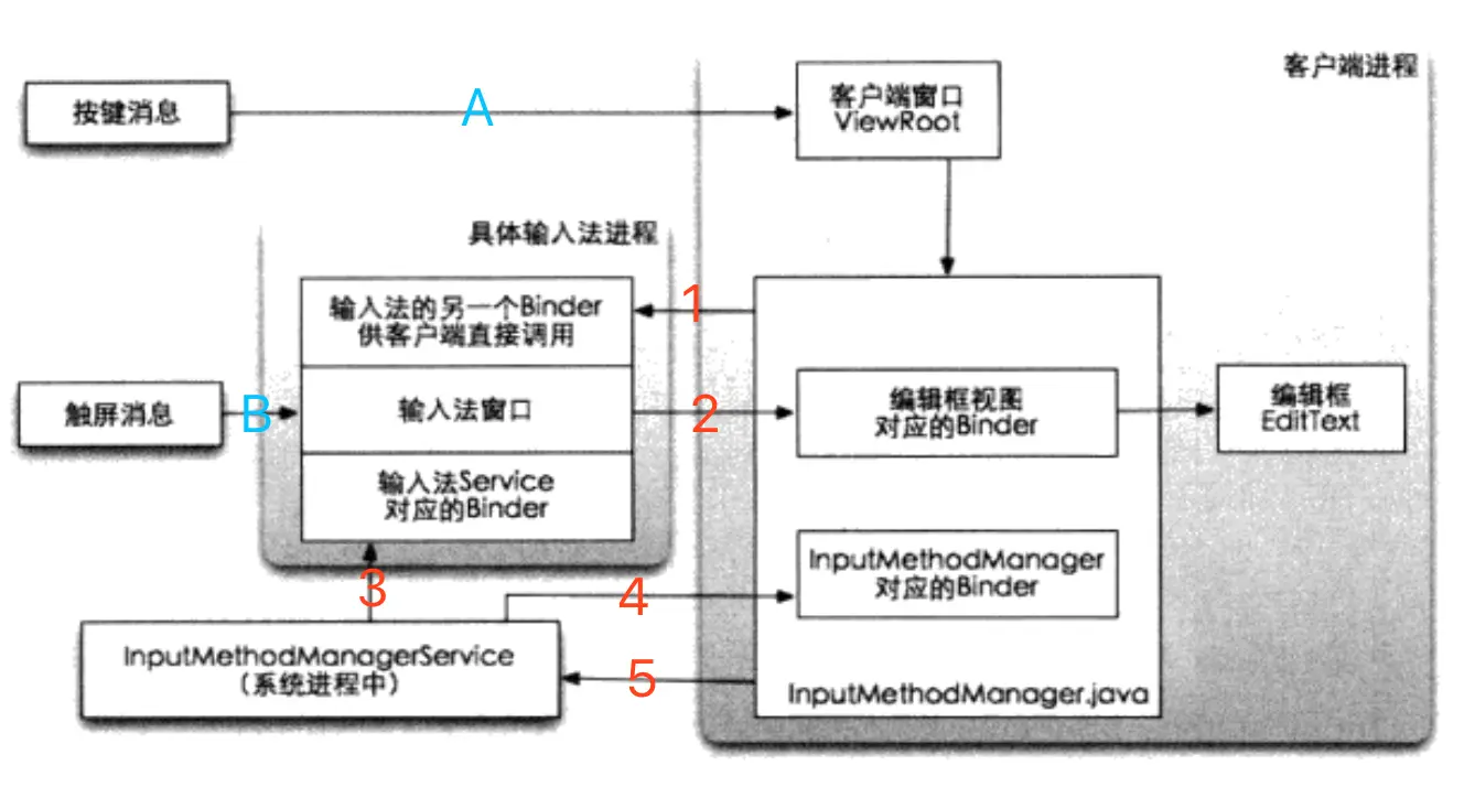 图里边用红色数字标注的地方是用binder进行通信的,而蓝色标注的A,B处也是用binder通信,蓝色部分标注的是和普通app的按键触屏通信机制一样,在这里先不分析了。