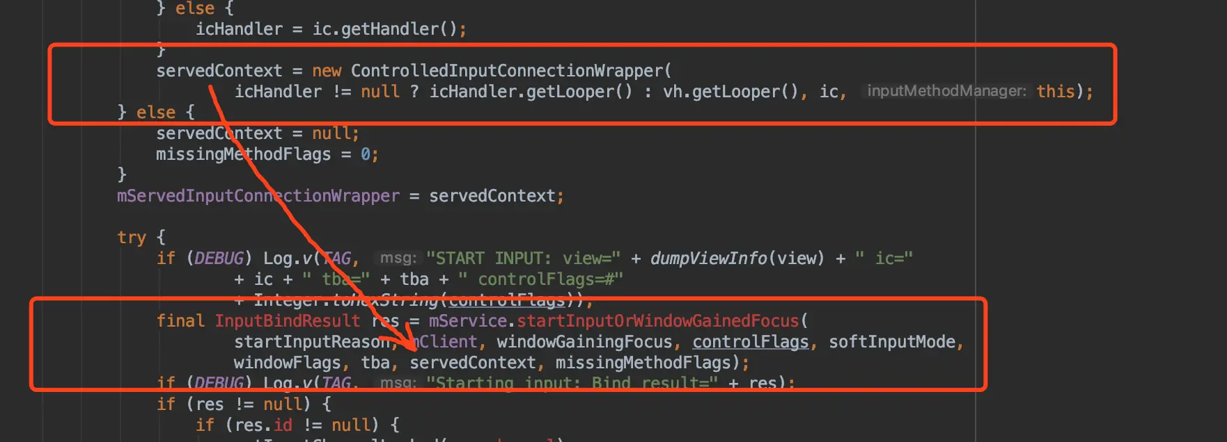 在客户端的InputMethodManager的startInputInner方法中,创建了ControlledInputConnectionWrapper对象,并把它作为参数调用IInputMethodManager的startInputOrWindowGainedFocus。IInputMethodManager正是IMMS对应的binder,这样就通过IMMS把ControlledInputConnectionWrapper对应的binder传递给了IMS端。