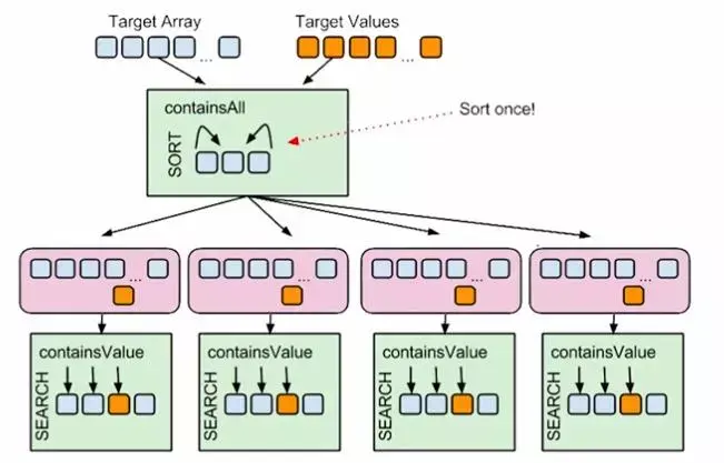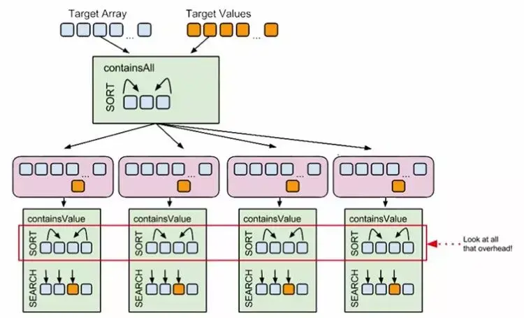 是在真正执行运算操作之前对数据进行批量预处理,例如你需要有这样一个方法,它的作用是查找某个值是否存在与于一堆数据中。假设一个前提,我们会先对数据做排序,然后使用二分查找法来判断值是否存在。我们先看第一种情况,下图中存在着多次重复的排序操作。