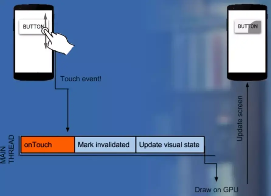 为了确保应用程序的高性能,每项功能都应该尽可能高效地运行。但是这些功能的执行时间以及它们在代码中所处的位置也很重要,当你首次启动一个Android应用程序时,朱执行线程就已经创建了,主线程非常重要,因为它负责运行你的代码,并在合适的视图位置发送事件和执行绘图功能。这些前面我们已经讲过,基本上来说,主线程是应用程序所在的线程,有时候,主线程也称为UI线程。例如,如果你触摸屏幕上的按钮,UI线程将会发送一个触摸事件给视图,视图将按钮状态设定为已按下设定,然后向事件队列发送一个有效请求,然后UI线程处理此请求,并通知按钮将其本身绘制为已按下状态。如果你有任何触摸事件的处理代码块,将会在线程中执行,这些触摸处理所用的时间越长,线程的执行时间就会越长,在绘图功能执行完之前,视图将会更新显示状态,让用户能够看到其状态,这里需要记住的是,输入处理代码与渲染和更新代码,共享这个线程的处理周期时间。