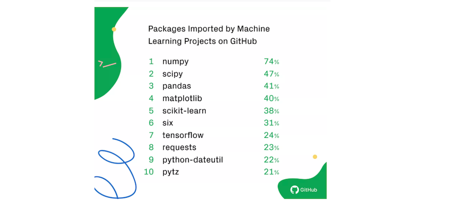 GitHub最近于自家部落格中,公布去年度机器学习和资料科学项目相关的报告,其中,平台上机器学习项目最热门的语言,前3名分别是Python、C++和JavaScript,而最受欢迎的函式库为Numpy,7成以上的机器学习项目都使用了Numpy函式库,Scipy函式库则是占了近5成。GitHub在去年10月公布的2018年度Octoverse报告中指出,机器学习和资料科学是GitHub上的热门主题,其中, Google的机器学习框架Tensorflow最受欢迎,而脸书推出的深度学习框架Pytorch则是成长最快速的项目,Python则是第三热门的程序语言。最近GitHub决定深入探讨机器学习和数据科学领域的数据,萃取出2018年度整年GitHub平台上的贡献数据,包含发布程序代码、提出Issues、提交审核请求等,针对大多数导入的函式库,GitHub则采用包含所有公开和私人储存库(repository)的依赖关联图(dependency graph)来分析。