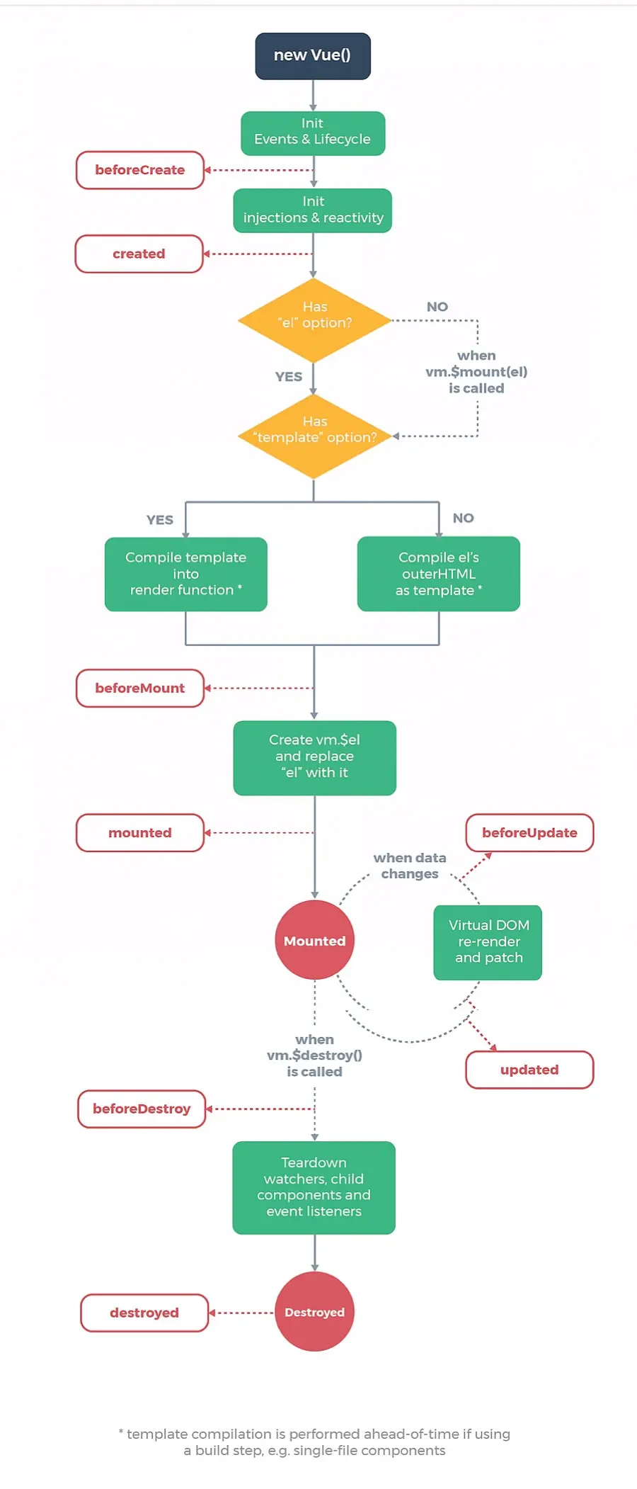 - 初始化过程:将实例挂载到DOM并在数据变化时更新DOM,同时在这一过程也会运行一些生命周期钩子函数,这给用户在不同阶段添加自己的代码的机会