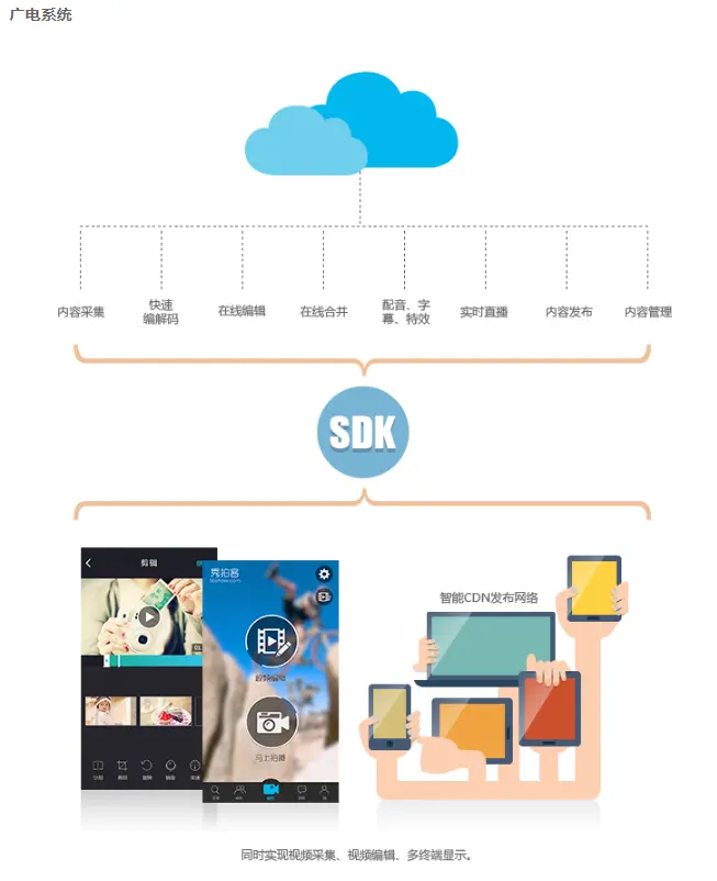 手机端的摄像头录制和直播功能结合强大的音/视频编辑功能整合App,建立高效、广泛的采集渠道,第一时间处理焦点新闻,突发事件。同时结合SaaS云视频存储、管理技术,建设内容丰富的电视台综合特色网站,改变传统媒体”单一渠道采集、封闭式生产、点对面单向传播”的动作模式,提高自身形象、扩大与公众交流途径、增强市场竞争力。