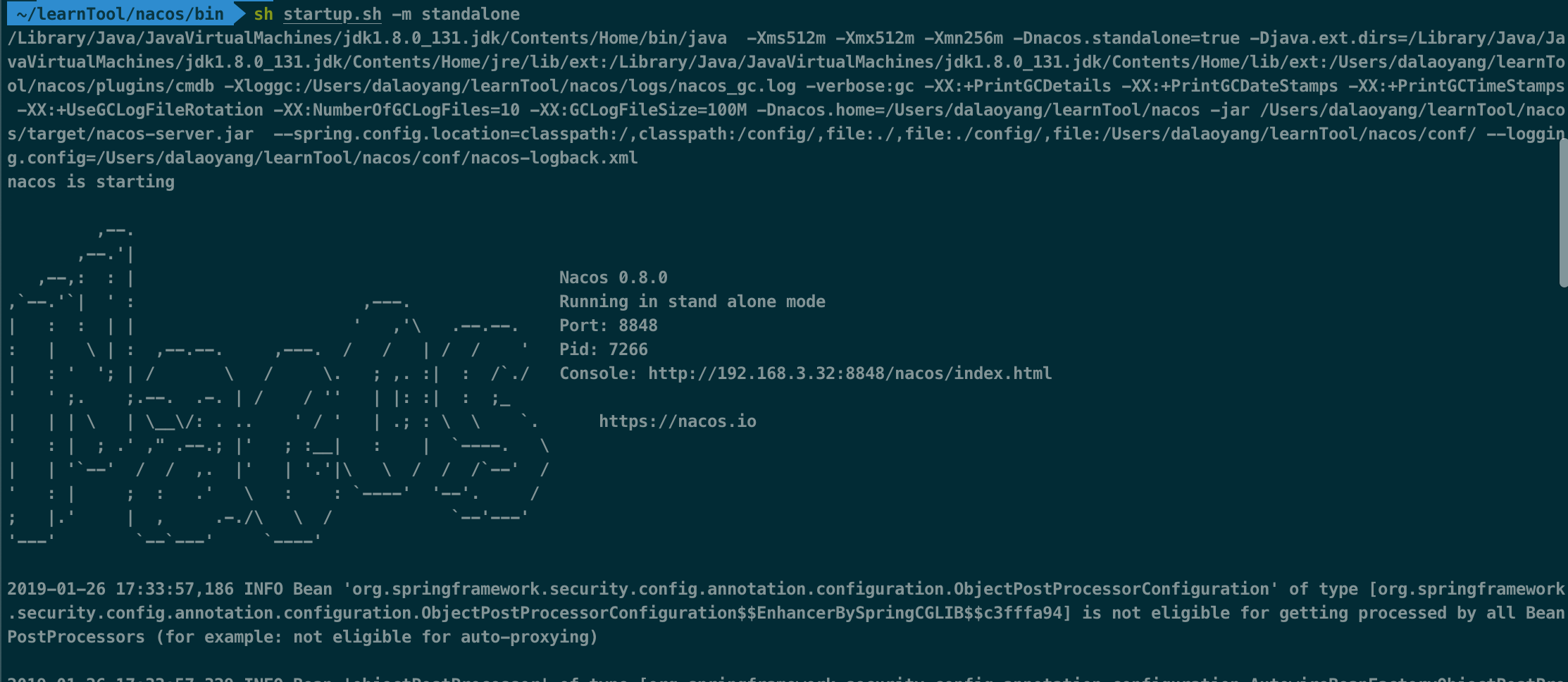 启动可以看到控制台如图所示,端口号是8848(好像是因为珠穆朗玛峰的高度),版本0.8.0等等信息。