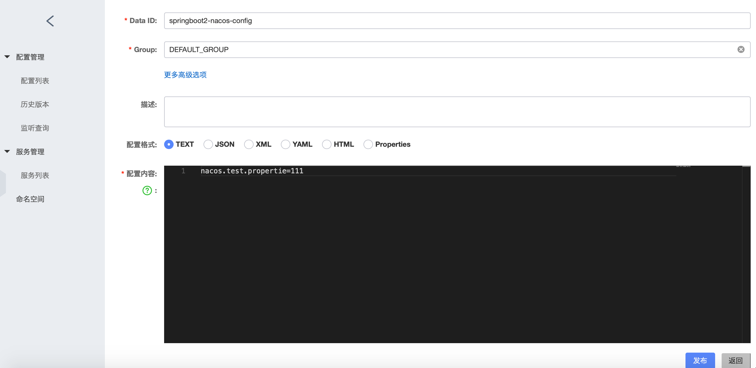 package com.dalaoyang;import com.alibaba.nacos.api.config.annotation.NacosValue;import com.alibaba.nacos.spring.context.annotation.config.NacosPropertySource;import org.springframework.boot.SpringApplication;import org.springframework.boot.autoconfigure.SpringBootApplication;import org.springframework.web.bind.annotation.GetMapping;import org.springframework.web.bind.annotation.RestController;@SpringBootApplication@NacosPropertySource(dataId = springboot2-nacos-config, autoRefreshed = true)@RestControllerpublic class Springboot2NacosConfigApplication { public static void main(String[] args) { SpringApplication.run(Springboot2NacosConfigApplication.class, args); } @NacosValue(value = ${nacos.test.propertie:123}, autoRefreshed = true) private String testProperties; @GetMapping(/test) public String test(){ return testProperties; }}