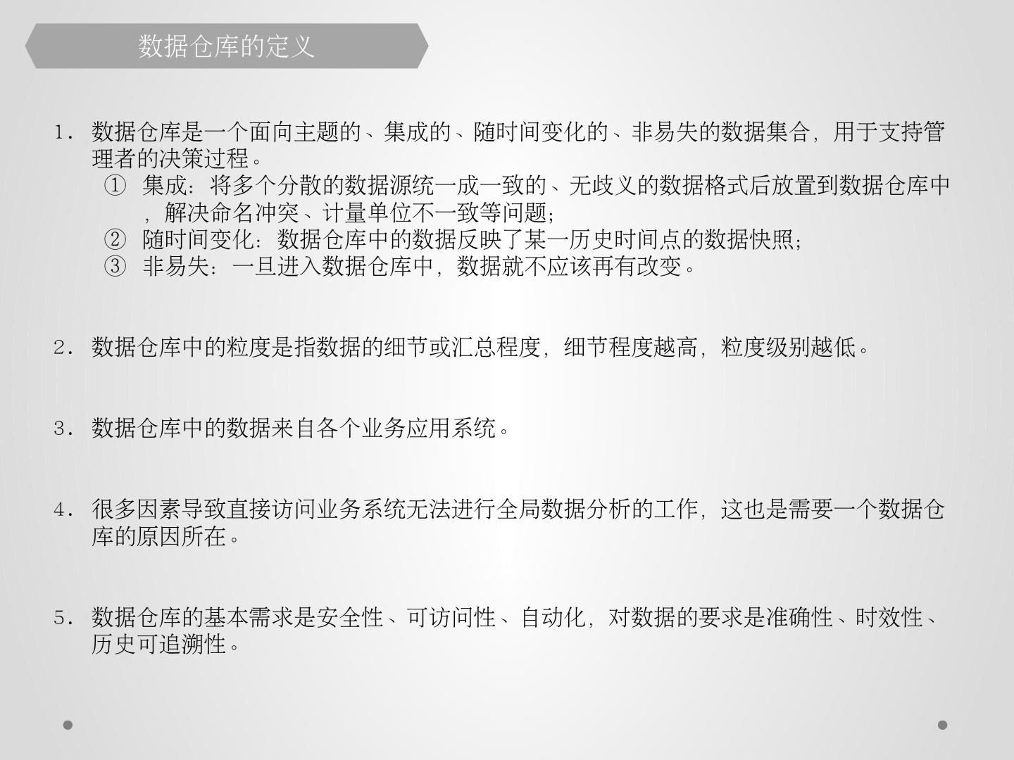 数据仓库的基本需求是安全性、可访问性、自动化,对数据的要求是准确性、时效性、历史可追溯性。