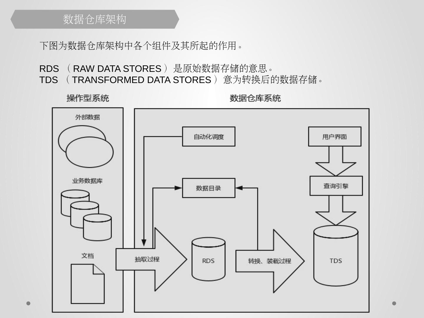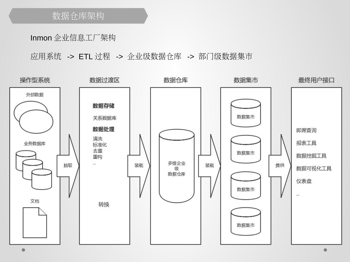 数据仓库是一个面向主题的、集成的、随时间变化的、非易失的数据集合,用于支持管理者的决策过程。 集成:将多个分散的数据源统一成一致的、无歧义的数据格式后放置到数据仓库中,解决命名冲突、计量单位不一致等问题; 随时间变化:数据仓库中的数据反映了某一历史时间点的数据快照; 非易失:一旦进入数据仓库中,数据就不应该再有改变。