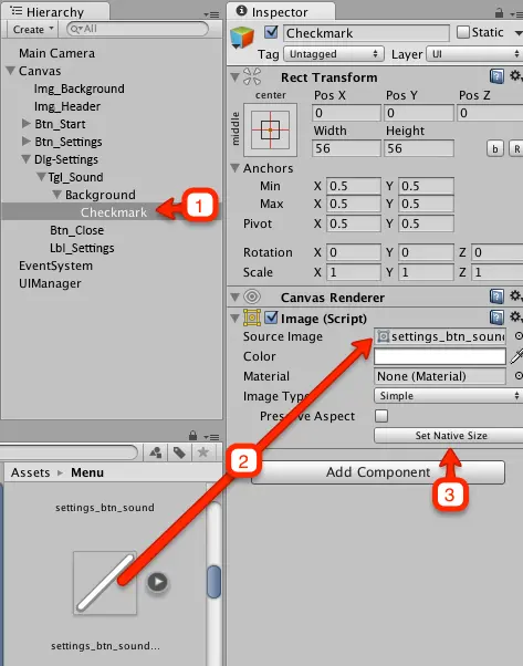 然后选择Checkmark并重复前面的步骤,但这次使用Project窗口中的settings_btn_sound_checkmark图像。