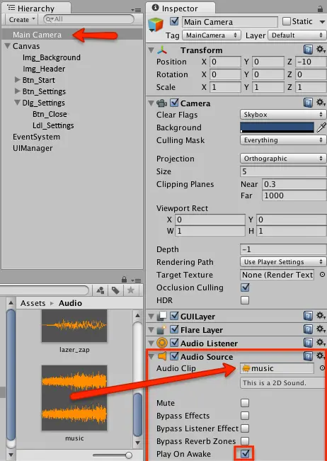 在层次结构中选择Main Camera,然后添加Audio Source组件。 然后,在Project window窗口中,打开Audio文件夹并将音乐拖动到“检查器”中的Audio Clip字段。