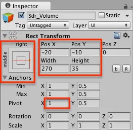 在Hierarchy中选择Sdr_Volume并将其锚点设置为middle-right。 然后将其锚点设置为(1,0.5),以便您可以使用其右边缘的中间点来定位它。