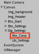选择GameObject \ UI \ Button以创建按钮。 将此新按钮重命名为Btn_Close并将其拖动到层次结构中的Dlg_Settings上,以将其添加为子对象。 此外,此按钮上没有文本,因此删除嵌套在Btn_Close中的Text对象。
