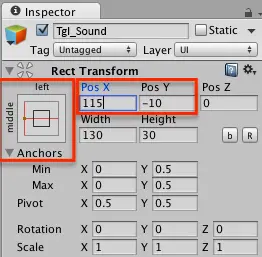 在层次结构中选择Tgl_Sound。 将其锚点设置为middle-left,Pos X设置为115,Pos Y设置为-10。