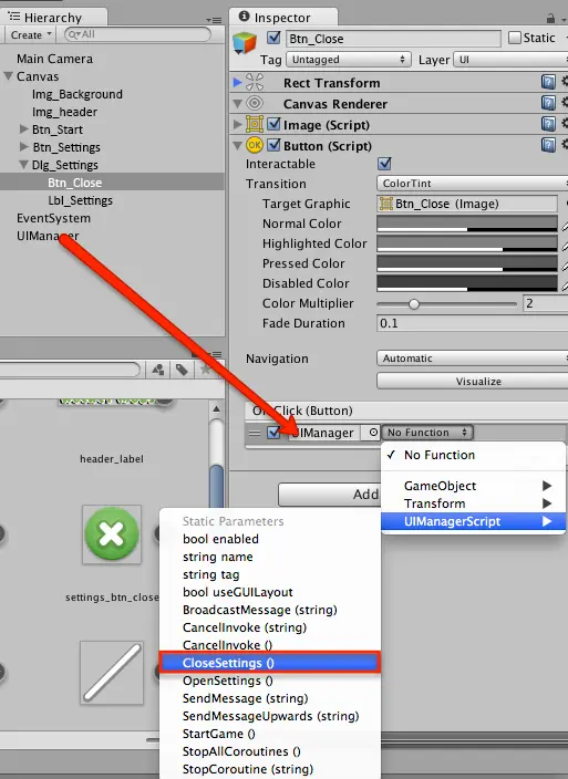 在Hierarchy中选择Btn_Close,向下滚动到On Click()列表并单击+。 将UIManager从Hierarchy拖动到新项目,然后在下拉列表中选择UIManagerScript \ CloseSettings()方法。