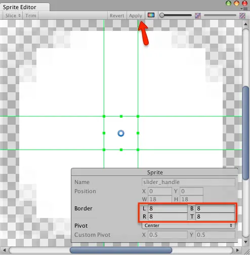 对于每个图像,在Inspector中打开Sprite Editor,并将Border的所有值设置为8,单击Apply。