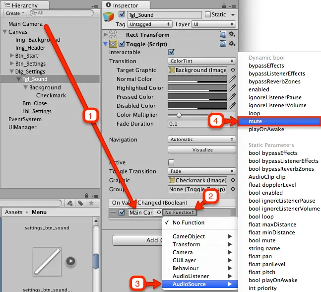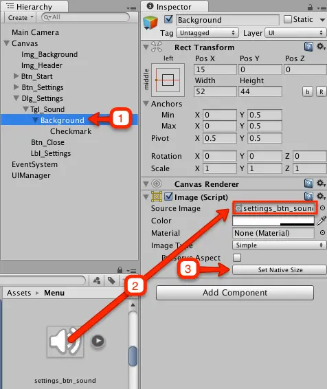 选择层次结构中tgl_sound中包含的背景,并将“项目”窗口中的settings_btn_sound拖动到Inspector中的Source Image。 然后单击Set Native Size。