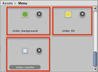 在Project窗口中打开Menu文件夹,找到与滑块各部分对应的三个图像:slider_background,slider_fill和slider_handle。