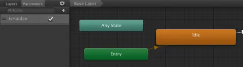 禁用Animator组件,以便通过将isHidden的默认值设置为true,它不会在开始时播放动画。 单击Animator窗口中的一些空白区域,然后将isHidden设置为true