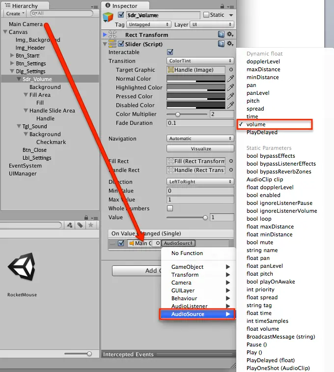 选择GameObject \ UI \ Slider添加滑块。 将其重命名为Sdr_Volume并将其放在Dlg_Settings中。