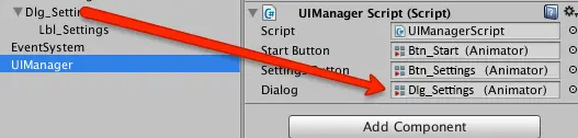 在Hierarchy中选择UIManager,然后将Dlg_Settings拖到Inspector中的Dialog字段中。