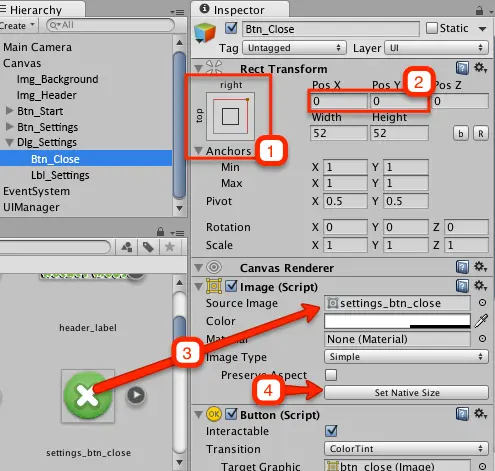 Menu文件夹,然后将settings_btn_close拖到“检查器”中的Source Image字段中。 - 4) 单击