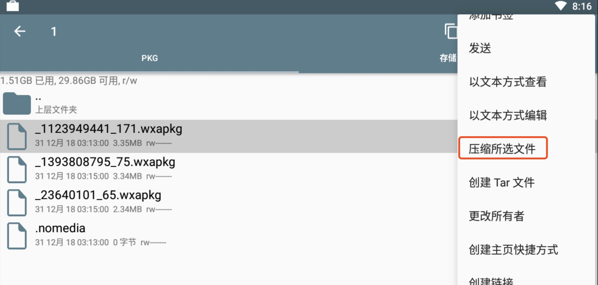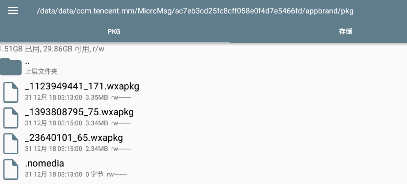 三、安装好微信和RE文件管理器后访问/data/data/com.tencent.mm/MicroMsg/{{一个16进制字符串}}/appbrand/pkg/目录