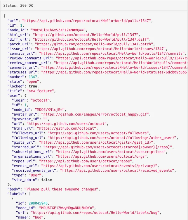 One of the ways to identify what rules we can automate is by looking at Github’s pull request API response. By comparing the API response with our pull request checklist or guideline, we can get an idea of the possibilities that are there. This is how the response looks like: