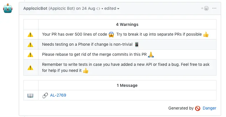For reference, you can check ApplozicSwift’s Dangerfile or in some of the other popular open source projects like React Native or CocoaPods. I discovered while writing this blog post that projects like React Native and React were also using danger. This shows us how this process of automating these checks has become part of the common pull requests workflow.