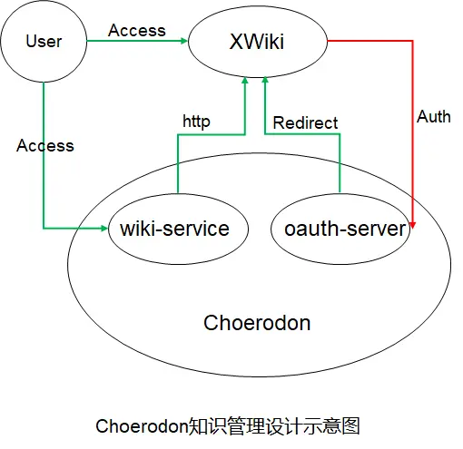 Choerodon猪齿鱼平台是基于spring cloud的微服务架构开发,而Choerodon知识管理选择以XWiki作为开发的基础,那么就需要做到统一的用户、权限以及组织架构。因此开发团队开发了微服务wiki-service,这个微服务主要用于监听Choerodon平台中其他服务的操作,比如IAM的创建组织、创建项目等,然后使用http请求的形式,让XWiki做对应的业务处理,比如创建对应的空间和页面。另外XWiki需要使用Choerodon猪齿鱼平台统一的登录和权限校验,所以Choerodon在XWiki中添加了OAuth登录认证。下图是Choerodon猪齿鱼知识管理设计示意图: