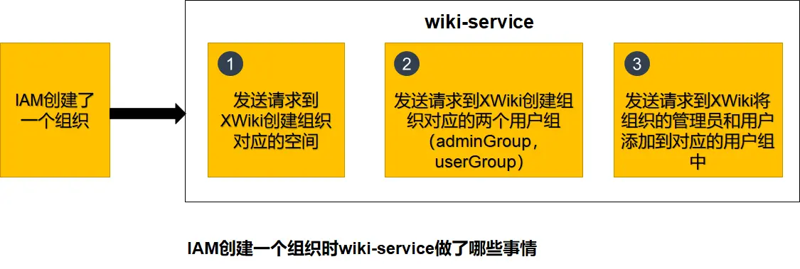 Choerodon猪齿鱼平台中有三层组织层次,即全局层、组织层和项目层。Choerodon 使用三层组织结构来管理用户、权限、项目、环境资源、菜单,以及其他系统资源和功能。其中全局层包含了系统的一些基本设置,例如组织管理、菜单管理、全局角色管理等;组织层管理用户、权限、项目、环境资源,以及其它系统资源和功能;项目层用来管理软件的开发,项目属于组织。Choerodon知识管理也是按照组织层和项目层,以及组织和项目下的空间来管理wiki的。为了保证XWiki与Choerodon平台有统一的组织和项目以及组织、项目对应的人员、权限等,需要将每个组织项目的创建、角色分配等都在XWiki中做对应的处理。下图是当IAM创建一个组织时,wiki-service为保证数据一致性做的处理: