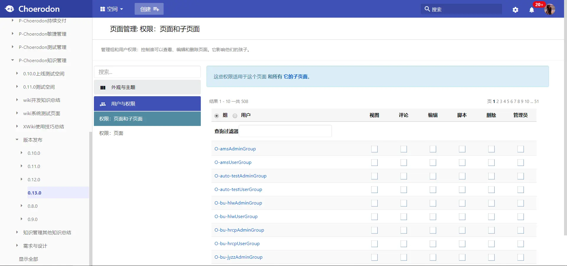 在Choerodon知识管理中,空间和页面采用相同的权限模型,以用户组的形式配置权限。对于组织和项目下的空间、以及空间下的页面,在不单独配置权限的情况下,默认是继承组织和项目的权限的,也就是只有组织或者项目成员才可以查看。