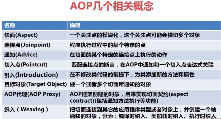 AOP基本概念 展飞 2019-01-29 135 阅读1分钟 1. AOP基本概念及特点 2. 什么是AOP 3. 切面 4. AOP实现方式 5. AOP几个相关概念 6. 通知Advice的类型 7. 有无接口的Spring AOP实现区别