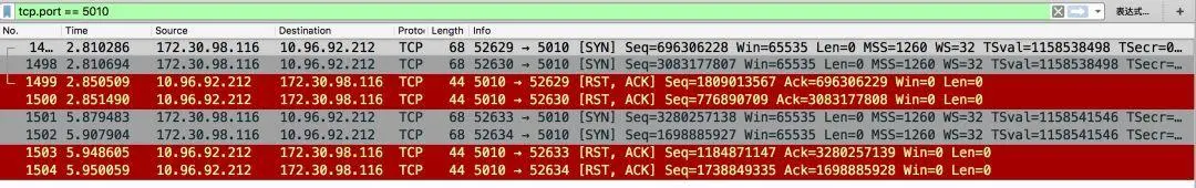 5010, 这个端口没有服务监听,和关闭gcs服务进程是同样的效果。可以看到,客户端发送SYN报文,但直接被远程docker RST掉了。因为服务端操作系统找不到监听此端口的进程。