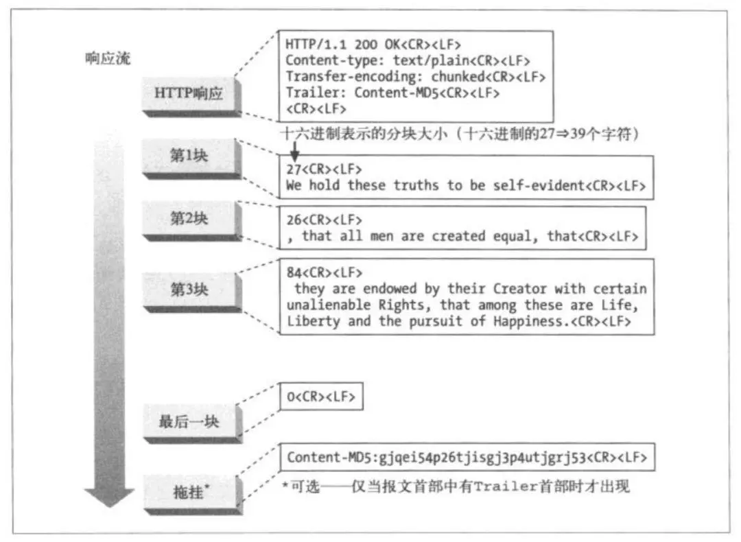 <CR><LF>用于区隔长度值和数据。长度值不包含分块中的任何 <CR><LF>序列。最后一个分块,用长度值0来表示结束。注意报文首部包含一个 Trailer:Content-MD5, 所以在紧跟着最后一个报文结束之后,就是一个拖挂。其他如, Content-Length, Trailer, Transfer-Encoding也可以作为拖挂。