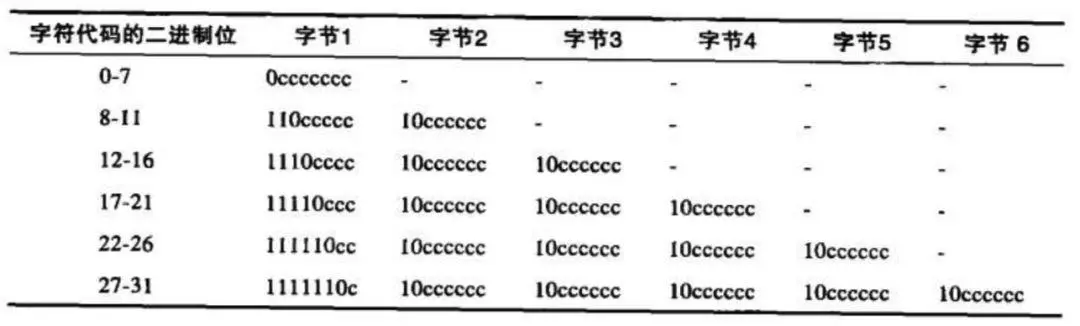 US-ASCII是把每个字符编码成固定的7位二进制值。 UTF-8则是无固定的编码方案。第一个字节的高位用来表示编码后的字符所用的字节数(如果所用的字节数是5,则第一个字节前5bit都是1,第6bit是0),所需的后续的字节都含有6位的代码值,前两个bit位是用 10标识。