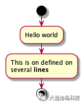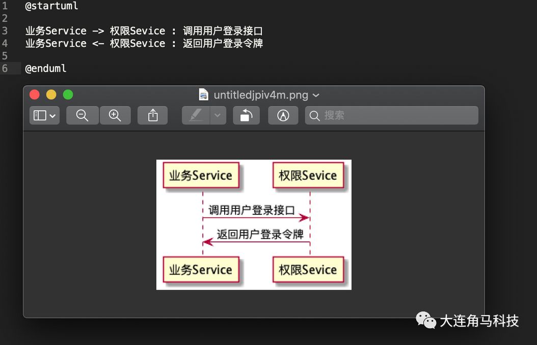 简单地讲,我们使用画图工具时需要一个一个图去画,但使用 PlantUML 只需要用简洁直观的文字表达出图的内容,然后就可以直接生成图片。看一个最简单的例子: