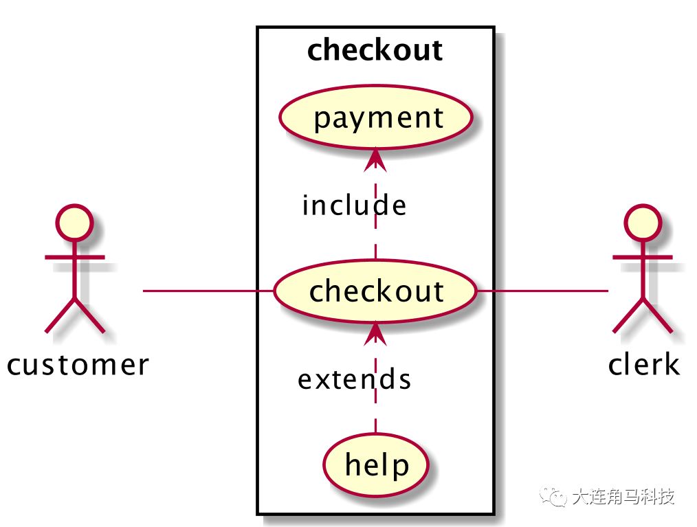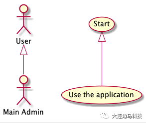 使用符号(<|–)来表示用例或者角色的扩展或者继承。代码如下: