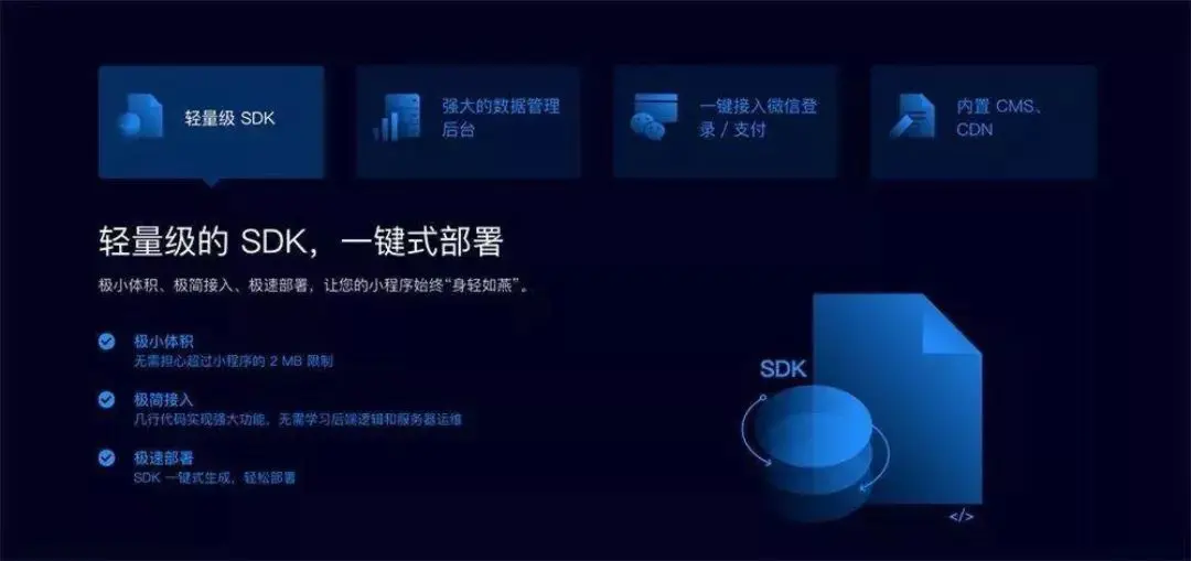 这一年多来,我们聚焦在 Serverless(无服务器架构)= BaaS(后端即服务) + FaaS(函数即服务)两大基础能力的同时,也针对微信小程序平台的各项能力做了深度支持,提供了大量开箱即用的功能,如——