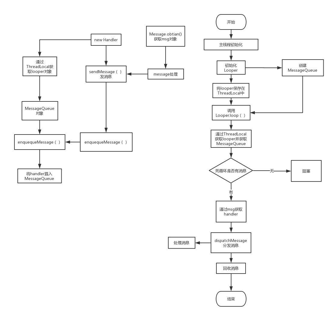 Looper,线程中默认是没有Looper的如果需要使用Handler就必须为线程创建Looper。主线程会在被创建时初始化Looper。Looper可以通过Looper.prepare()来创建,并通过Looper.loop()来开启消息循环。prepare() 可以创建looper并将looper对象保存在ThreadLocal中。Looper也可以退出,quit会直接退出Looper,而quitSafely把消息队列中已有的消息处理完毕后才安全退出。Looper最重要的方法是loop(),loop()是一个死循环唯一跳出循环的方式是MessageQueue 的next方法返回了null,loop()通过调用MessageQueuede 的next方法获取新消息,而next是一个阻塞操作,如果没有消失时next会一直阻塞在那里。也导致loop也一直阻塞。当有消息时Looper就会出来这条消息通过调用dispatchMessage将消息交个Handler,最后回收消息。