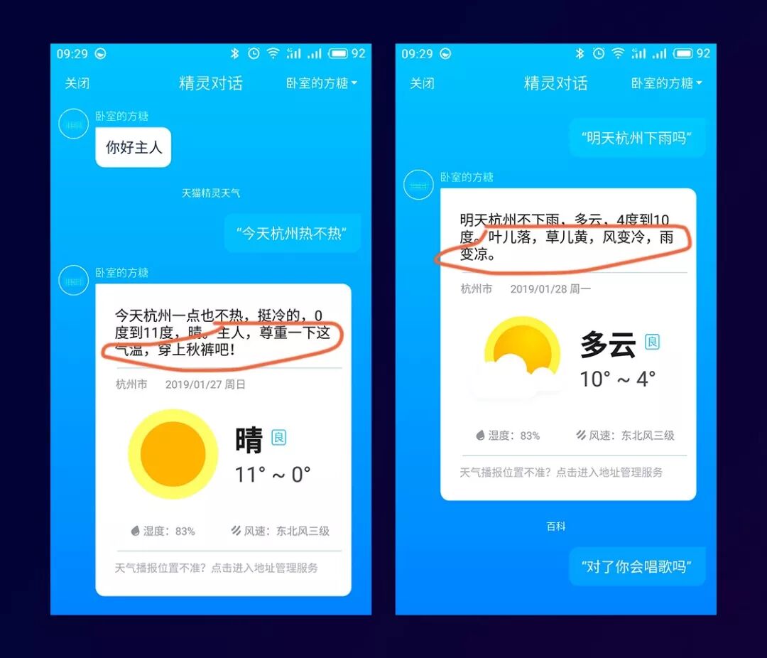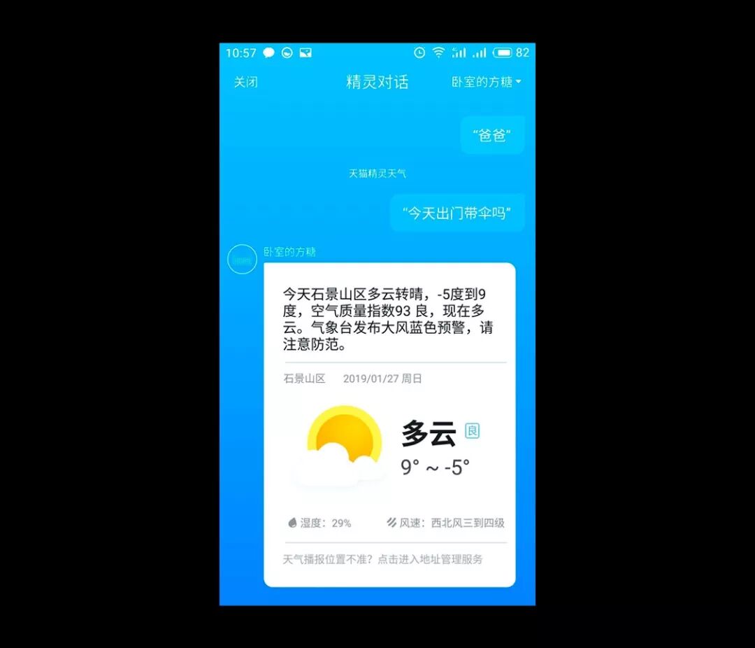 可以看出,基础的天气信息加上人格化的场景,模拟人和人之间真实的沟通场景,给用户带来符合预期的对话体验。